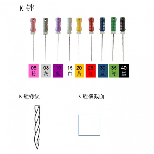 Usage method of K file: Use EDTA to lubricate the root canal, use the twist approach to use K file, that is, rotating back and forth at 45 degrees, pull up when encountering resistance, until eliminate friction, then move forward until up to the estimated length of work., in the process, if there are too many shards need to rinse with the 0.5%-5.25% of sodium hypochlorite. After preparing, change the size of K file to keep on preparing, until prepare to 15#